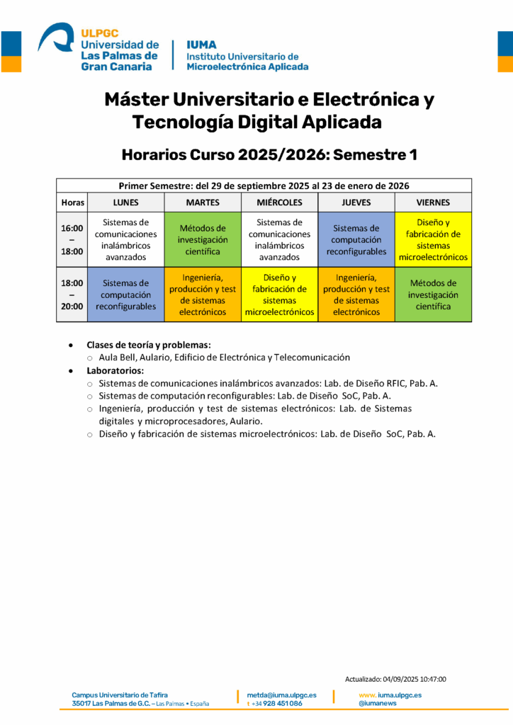 ULPGC academic calendar for master's degree programs for the 2025/2026 academic year. It includes detailed information on the start and end dates of classes, vacation periods, exams, and submission dates for the Master's Thesis. During the second semester, dual training students must adapt to the work schedule of the company where they are doing their training.